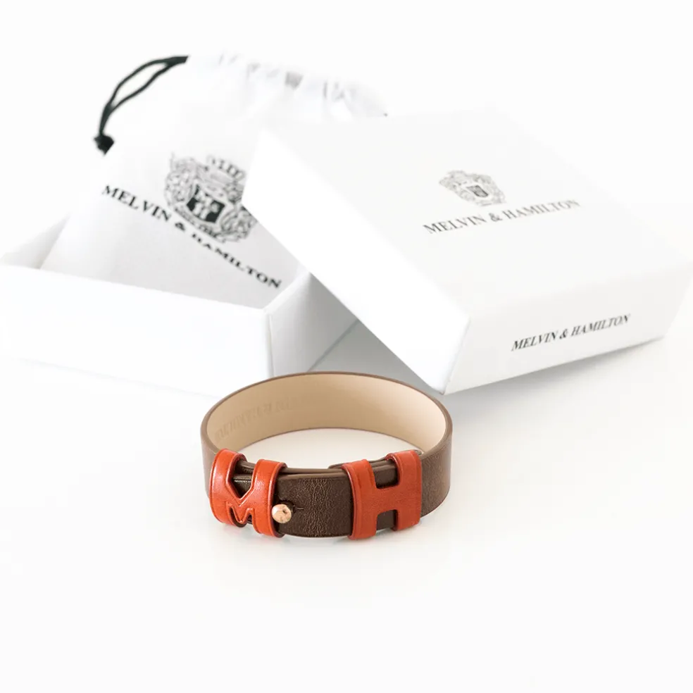 Bei Melvin & Hamilton haben wir unsere Armbänder-Kollektion durch Archie ergänzt. Archie aus vegetabil gegerbtem Leder lässt sich solo tragen oder auch mit anderen Armbändern kombinieren. Es ist in vielen Farben erhältlich, wie zum Beispiel dieses schicke braun ergänzt durch die orangenen Initialen der Marke. Mit diesem Armband geben Sie Ihrem Outfit das gewisse Etwas!