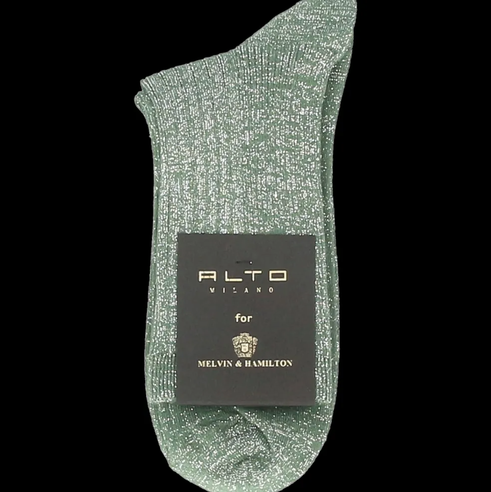 Die Socken Beziers in grün überzeugen mit ihrem schlichten Design und einem Hauch von Glitzer für einen glamourösen Look. Entworfen und hergestellt von Alto Milano für Melvin & Hamilton, steht das Logo des Herstellers für italienische Exzellenz. In Einheitsgröße passen sich diese halbhohen Socken perfekt deinem Fuß an und sind besonders langlebig.