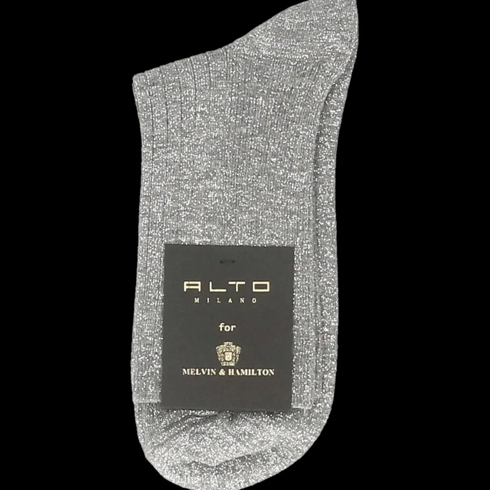 Die Socken Beziers in grau überzeugen mit ihrem schlichten Design und einem Hauch von Glitzer für einen glamourösen Look. Entworfen und hergestellt von Alto Milano für Melvin & Hamilton, steht das Logo des Herstellers für italienische Exzellenz. In Einheitsgröße passen sich diese halbhohen Socken perfekt deinem Fuß an und sind besonders langlebig.