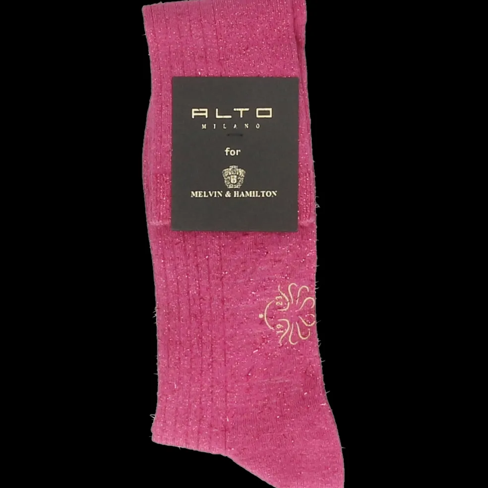Verliebe dich in die langen Socken Menton in rosa mit ihrem hohen Schnitt und ihrem einzigartigen Design. Mit ihrem gerippten und glitzernden Aussehen verleihen diese Socken deinem Look den glamourösen und femininen Touch. Entworfen und hergestellt von Alto Milano für Melvin & Hamilton, bestehen die Menton-Socken zu 80 % aus Baumwolle, was sie zu einer komfortablen und angenehmen Wahl für den Alltag macht.