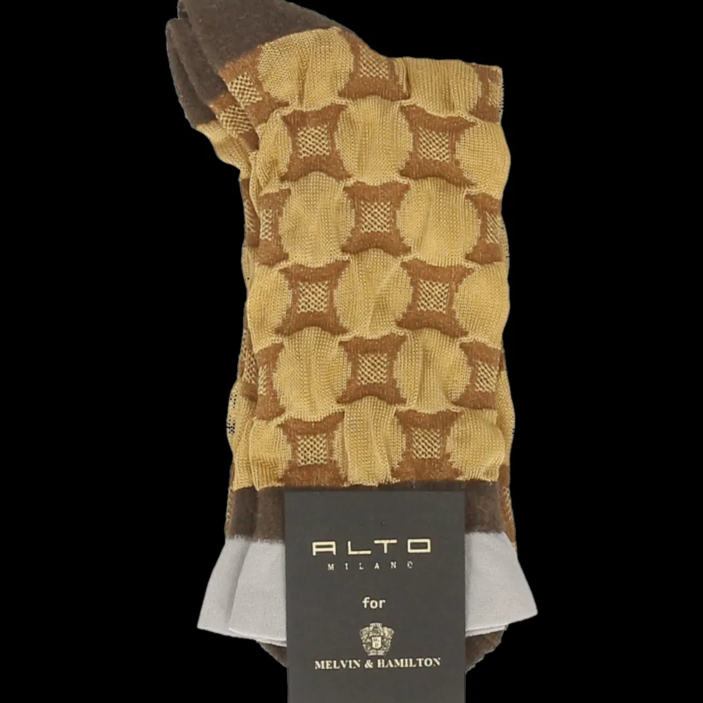 Die halblangen Socken Agde in gold bestechen durch ihr schlichtes Design mit geometrischen Mustern, für einen originellen Touch an deinen Füßen. Entworfen und hergestellt von Alto Milano für Melvin & Hamilton, garantiert dir die exzellente italienische Herstellung eine hohe Qualität. Diese halbhohen Socken aus 78% Viskose sind dünn und bequem. Dank ihrer Einheitsgröße passen sie sich perfekt an deinen Fuß an und werden lange halten.