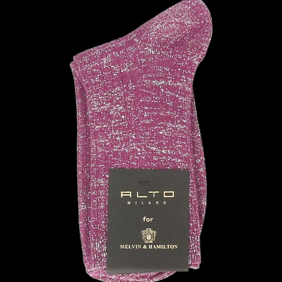 Die Socken Beziers in lila überzeugen mit ihrem schlichten Design und einem Hauch von Glitzer für einen glamourösen Look. Entworfen und hergestellt von Alto Milano für Melvin & Hamilton, steht das Logo des Herstellers für italienische Exzellenz. In Einheitsgröße passen sich diese halbhohen Socken perfekt deinem Fuß an und sind besonders langlebig.