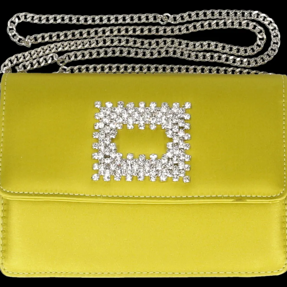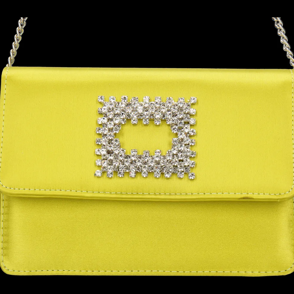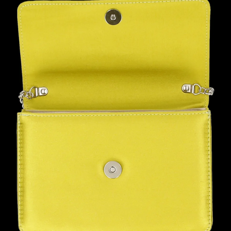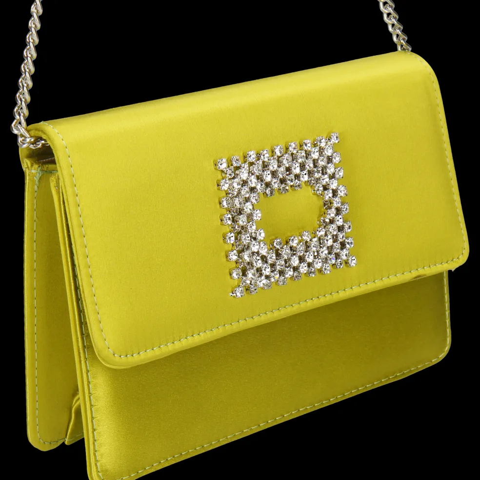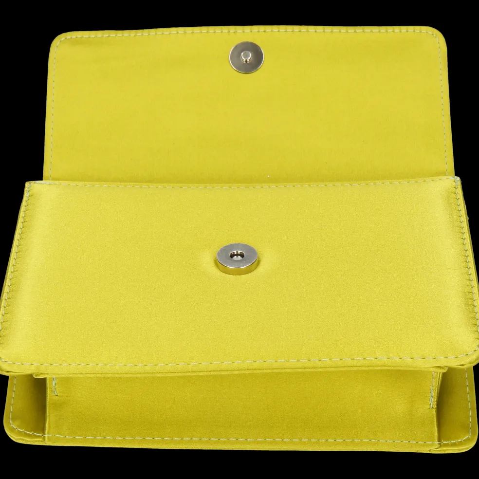Melvin & Hamilton präsentiert seine exklusive Capsule Collection in Zusammenarbeit mit der italienischen Marke Fratelli Russo. Die mit einem auffälligen quadratischen, kristallverzierten Magnetverschluss geschmückte Clutch wird in Italien hergestellt. Die Tasche aus gelb Satin Franca ist mit einer farblich abgestimmten Ziernaht versehen, die ihr ein handwerkliches Finish verleiht. Die Metallkette erlaubt es, die Clutch auch über der Schulter zu tragen.