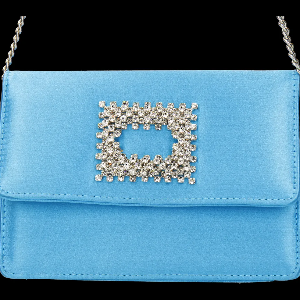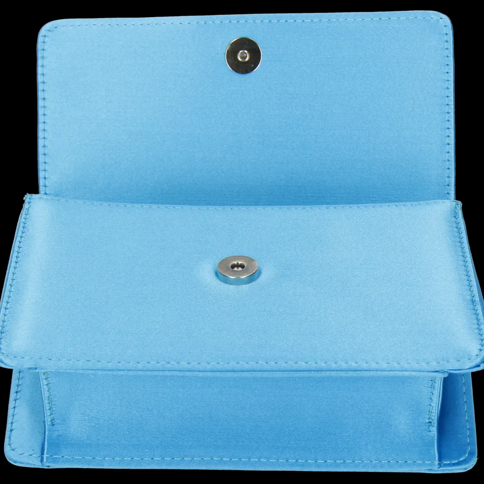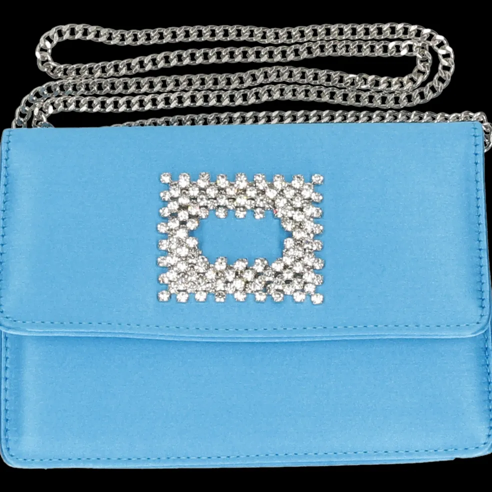 Melvin & Hamilton präsentiert seine exklusive Capsule Collection in Zusammenarbeit mit der italienischen Marke Fratelli Russo. Die mit einem auffälligen quadratischen, kristallverzierten Magnetverschluss geschmückte Clutch wird in Italien hergestellt. Die Tasche aus türkis Satin Franca ist mit einer farblich abgestimmten Ziernaht versehen, die ihr ein handwerkliches Finish verleiht. Die Metallkette erlaubt es, die Clutch auch über der Schulter zu tragen.