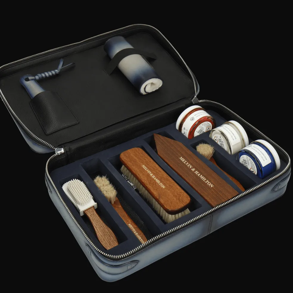 Der Besitz eines Schuhpflegesets ist ein Muss für Liebhaber und Kenner, die den Genuss und die Eleganz des Lederpflege-Rituals schätzen. Unser Gregory Schuhpflegeset enthält außergewöhnliche Produkte und Accessoires für die komplette Lederpflege. Bestehend aus einem Schuhlöffel, einem Polierhandschuh, fünf Bürsten für alle Lederarten und alle Teile des Schuhs sowie drei individuell anpassbaren Poliercremes, ist dieses Pflegeset das perfekte Geschenk für Schuhliebhaber, um deine Sammlung von Polituren und Bürsten zu erneuern. Unser Set entspricht den üblichen Kriterien von Melvin & Hamilton, da es aus pflanzlich gegerbtem Kalbsleder hergestellt wird.