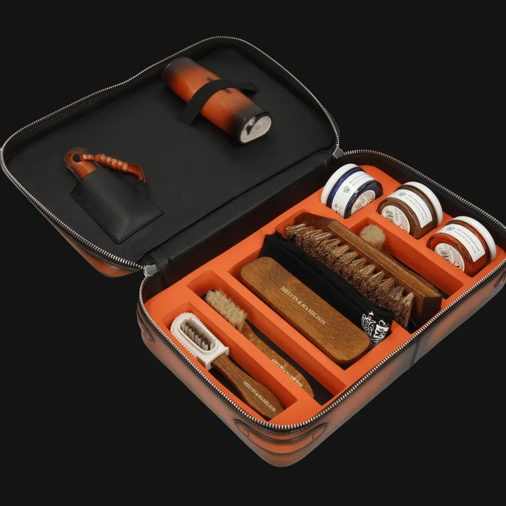 Der Besitz eines Schuhpflegesets ist ein Muss für Liebhaber und Kenner, die den Genuss und die Eleganz des Lederpflege-Rituals schätzen. Unser Gregory Schuhpflegeset enthält außergewöhnliche Produkte und Accessoires für die komplette Lederpflege. Bestehend aus einem Schuhlöffel, einem Polierhandschuh, fünf Bürsten für alle Lederarten und alle Teile des Schuhs sowie drei individuell anpassbaren Poliercremes, ist dieses Pflegeset das perfekte Geschenk für Schuhliebhaber, um deine Sammlung von Polituren und Bürsten zu erneuern. Unser Set entspricht den üblichen Kriterien von Melvin & Hamilton, da es aus pflanzlich gegerbtem Kalbsleder hergestellt wird.