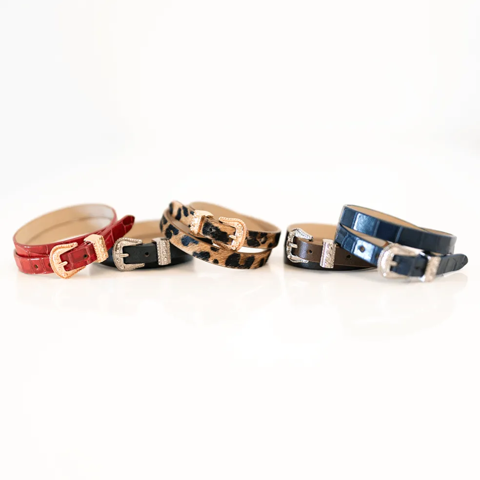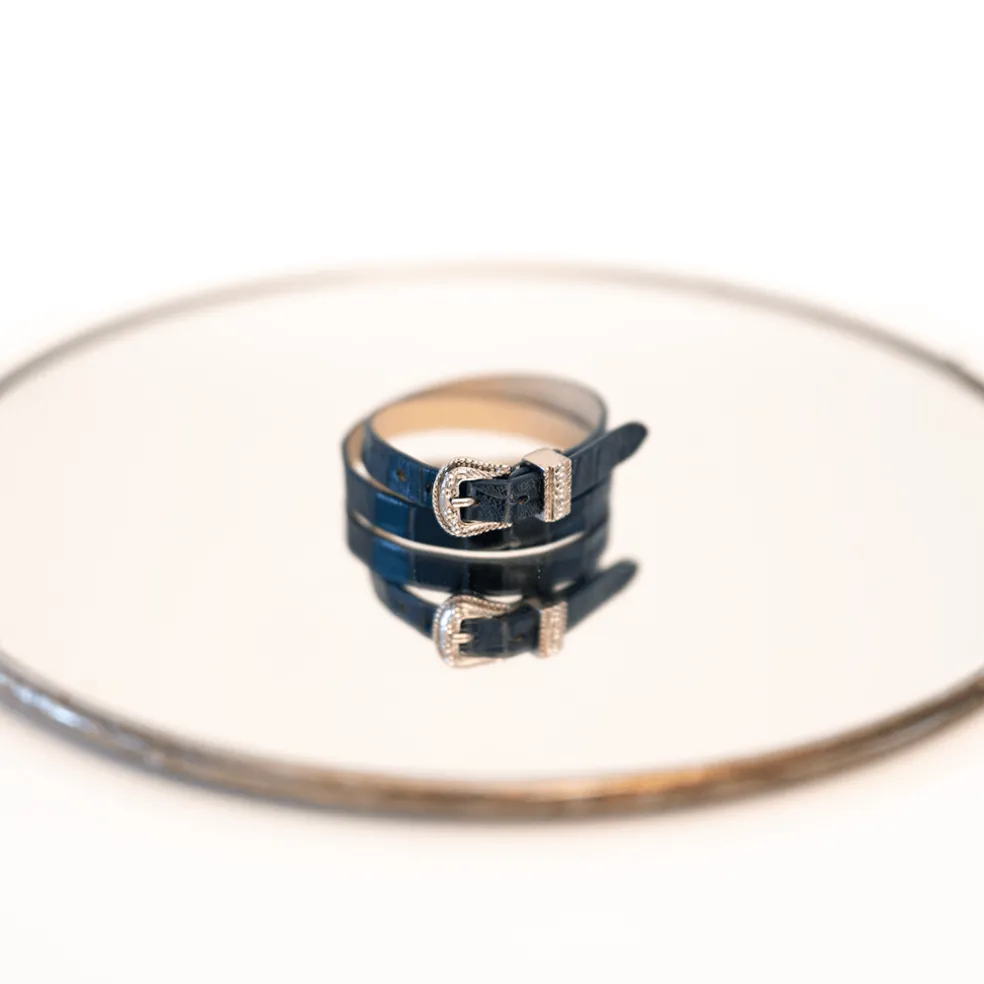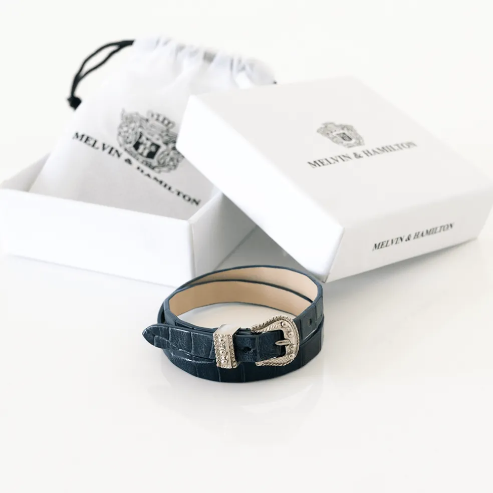 Wir bei Melvin & Hamilton lieben Armbänder aus hochwertigem Leder! Nicht nur Animal-Print ist total im Trend, auch mit Leder in Kroko-Optik liegen Sie immer richtig! Ines in dunkelblau ist ein einfach anzulegendes Wickelarmband mit silbernem Verschluss und gibt Ihrem Look eine besondere Note. Probieren Sie es aus!